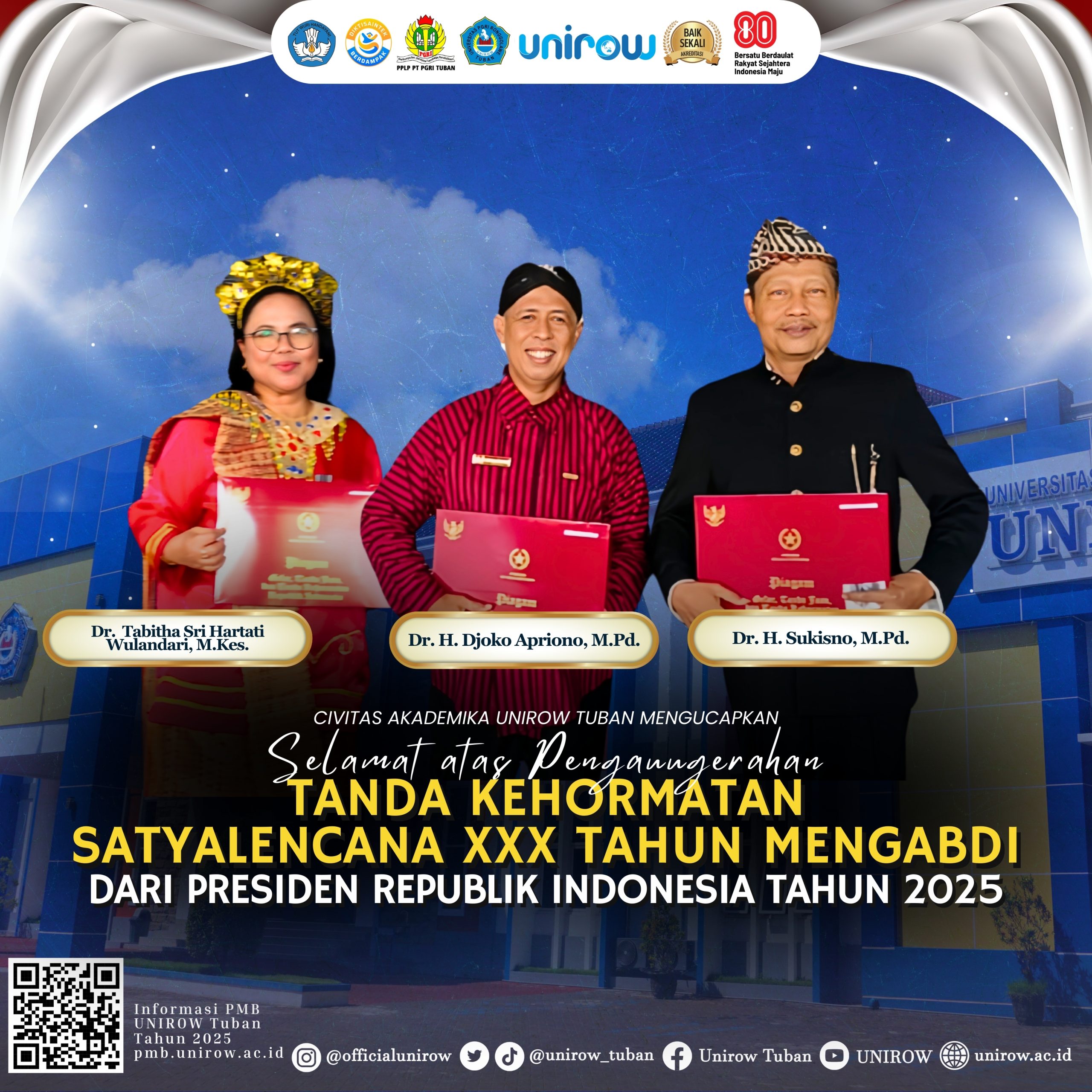 Universitas PGRI Ronggolawe (Unirow) Tuban kembali menorehkan prestasi membanggakan melalui tiga dosen yang diantaranya: 1) Dr. Tabitha Sri Hartati Wulandari, M.Kes., 2) Dr. H. Djoko Apriono, M.Pd., dan 3) Dr. H. Sukisno, M.Pd., yang telah berhasil meraih Anugerah Tanda Kehormatan Satyalancana Karya Satya dari Presiden Republik Indonesia. Penganugerahan ini diberikan berdasarkan Keputusan Presiden Nomor 30/TK/2025 sebagai bentuk penghargaan atas dedikasi, integritas, dan pengabdian dosen Unirow Tuban dalam menjalankan tugas pendidikan tinggi di Indonesia dalam 30 tahun mengabdi.